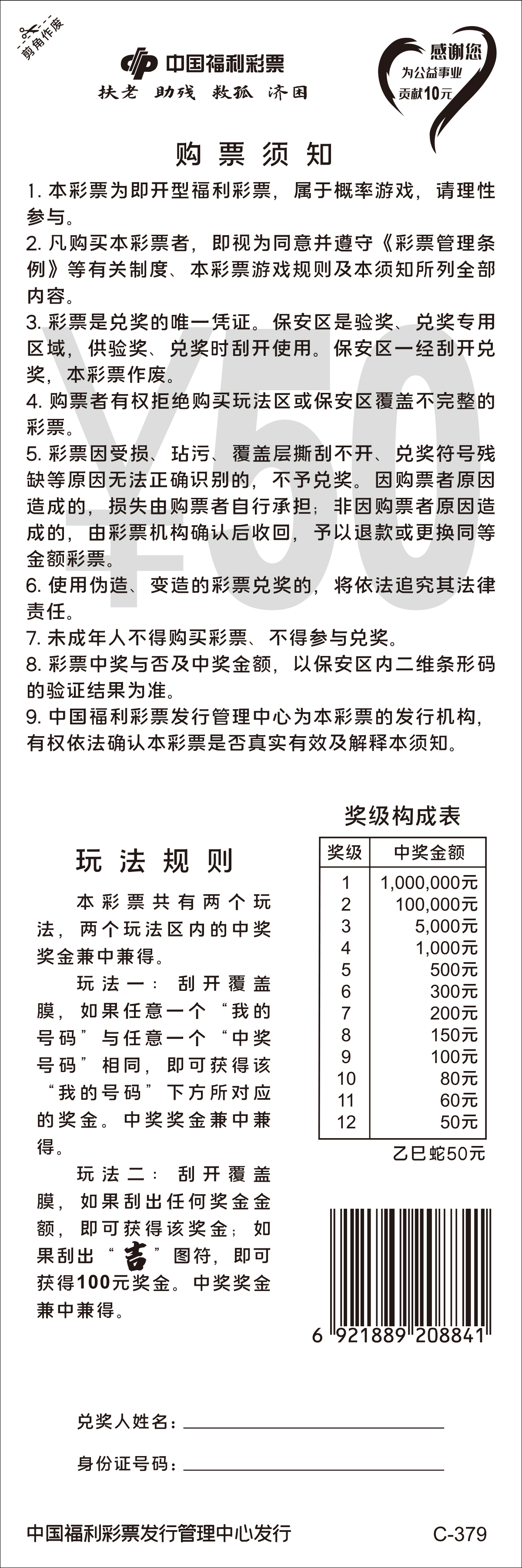 本彩票共有两个玩法,两个玩法区内的中奖奖金兼中兼得。 玩法一:刮开覆盖膜,如果任意一个“我的号码”与任意一个“中奖号码”相同,即可获得该“我的号码”下方所对应的奖金。中奖奖金兼中兼得。 玩法二:刮开覆盖膜,如果刮出任何奖金金额,即可获得该奖金;如果刮出“吉”图符,即可获得100元奖金。中奖奖金兼中兼得。
